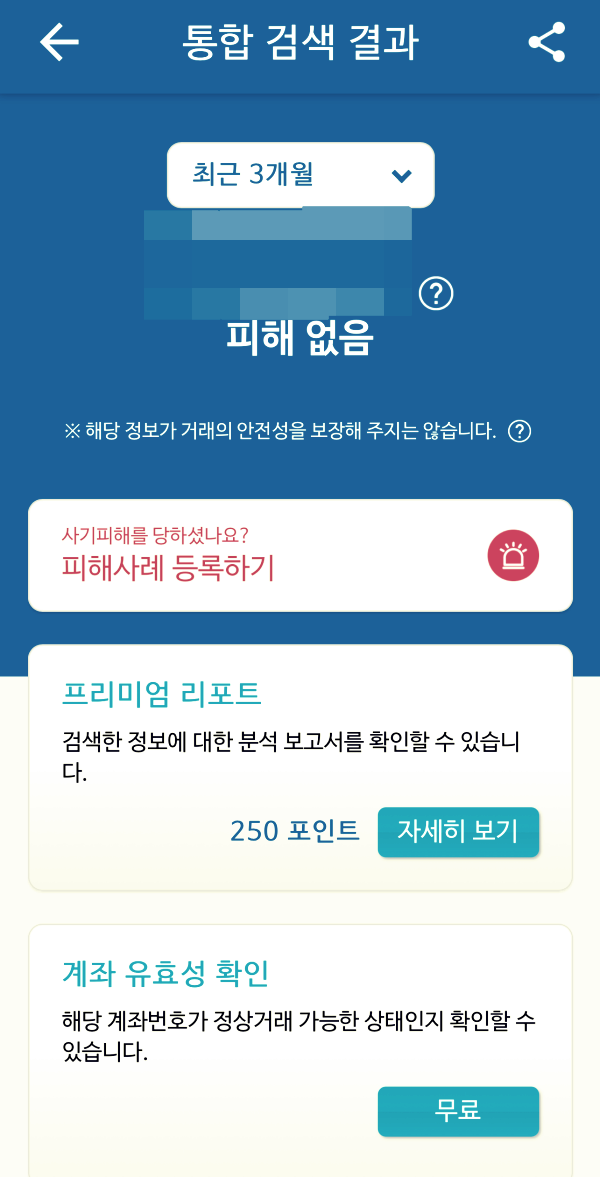 최근 3개월 피해 없음이라고 나옵니다. 피해 사례가 있을 시 결과가 나옵니다. 중고거래 상대방 연락처나 계좌가 더치트에서 피해 사례가 있을시 거래가 나옵니다.
