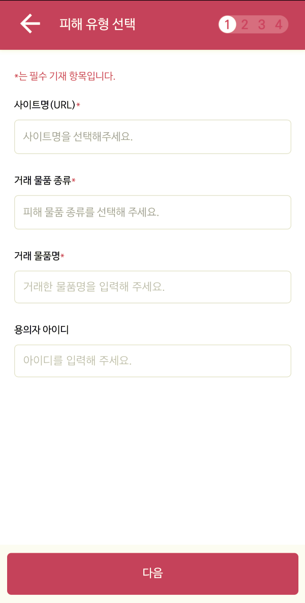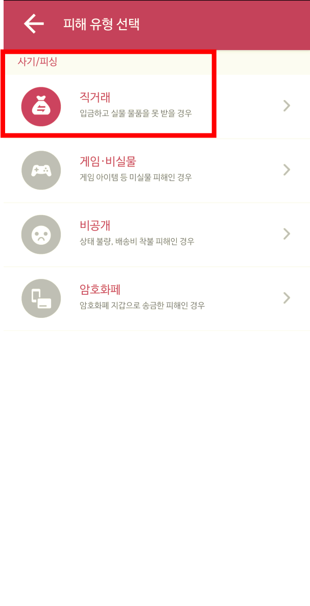 맨 위에 직거래 유형을 터치해보았습니다.4단계로 피해 사례를 등록하게 되어있습니다. 해당되시는 정보를 입력하여 어플로 간단하게 피해 사례를 등록할 수 있습니다.