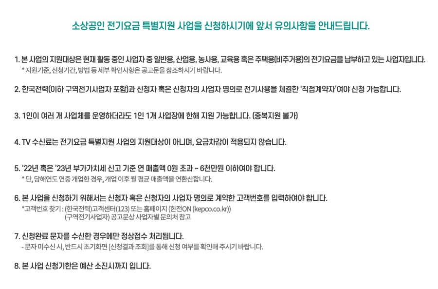 - 지원 금액: 지원금은 신청자의 사업 규모와 전기 사용량 등에 따라 차등 적용될 수 있습니다.