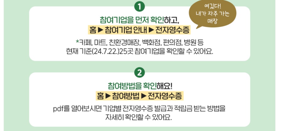 기업별 전자영수증 발급과 적립금 받는 방법을 pdf 파일로 제공하고 있으니, 이를 참고하여 정확한 참여방법을 숙지하시기 바랍니다.