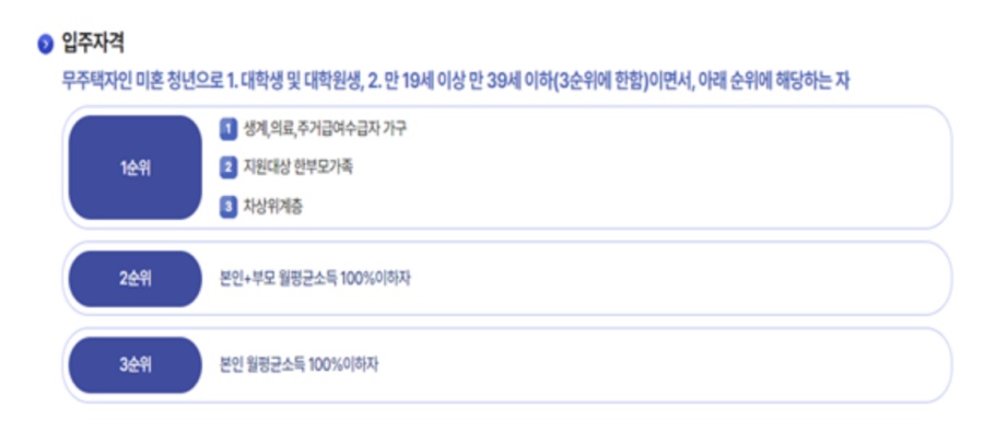 참고: 청약 신청은 무주택자인 미혼 청년으로, 대학생 및 대학원생 혹은 만 19세 이상 39세 이하의 청년(3순위 한정)이면 가능합니다.